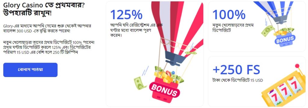 Glory Casino is generous with both new and existing players. The welcome bonus is flexible: newcomers can claim a 100% bonus on their first deposit, or even 125% if the deposit is made within an hour of registration. For example, deposit 5,000 BDT and play with 10,000 — a great way to extend your sessions.